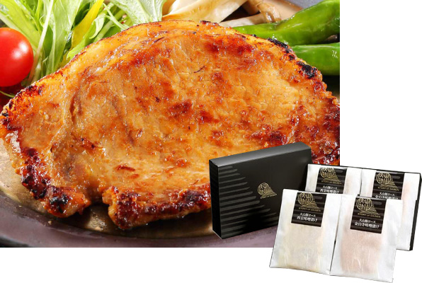 <大山物語>氷温熟成大山豚ロース味噌漬けセット きめ細かく柔らかな肉質の「大山豚」。氷温熟成でさらにうま味が増し、しっとり柔らかく仕上げました。西京味噌と金山寺味噌にじっくりと漬け込まれたお肉は、コクのある甘みと焼き上げた際の香ばしさが一体となり噛みしめるほどに美味しさが広がります。 |